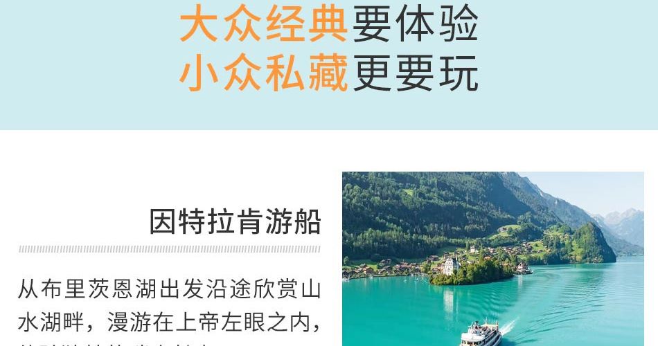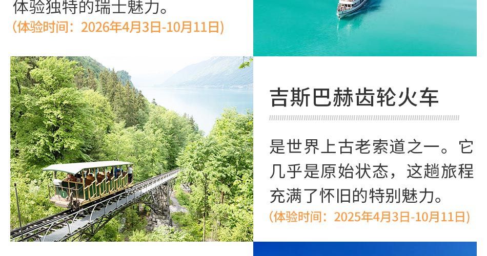 2、每年春夏秋季产品含巴赫齿轮小火车和因特拉肯游轮,体验时间:2026年4月3日-2026年10月11日,无法体验以上两个项目期间,我社将替换为卢塞恩游船;
