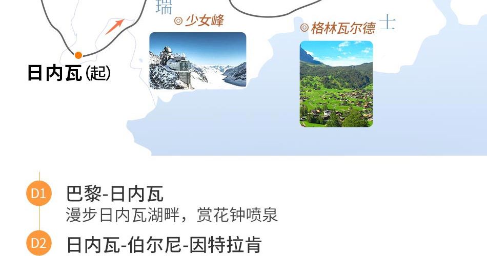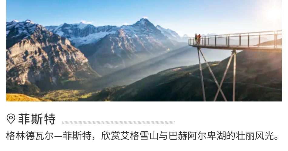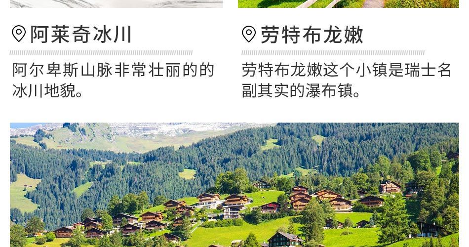 选择少女峰,则默认不去菲斯特;选择菲斯特,则默认不上少女峰。如都不选择,则默认跟车游览维尔德斯维尔、格林德尔瓦尔德及劳特布龙嫩。