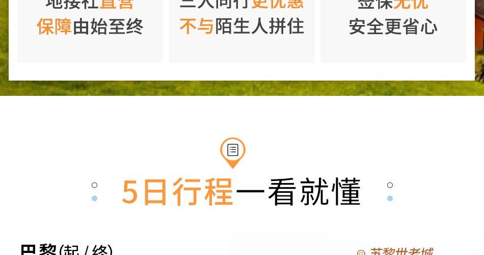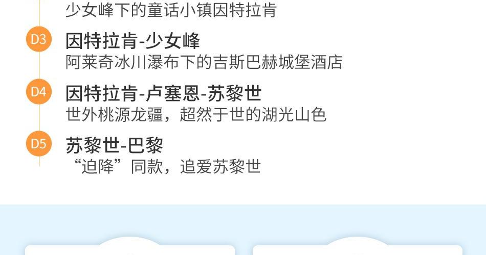 本产品不推荐参团当天早上降落巴黎的航班,结束当天可预定晚上的航班离开苏黎世,不推荐结束当天的航班离开巴黎!