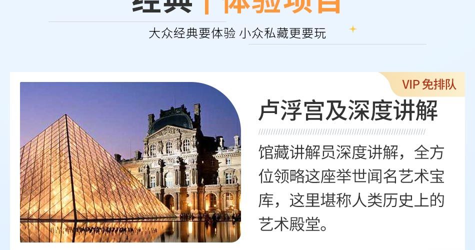是世界上古老的博物馆之一,是一座举世闻名的艺术宝库。卢浮宫建筑呈“U”形,分别为新、旧两个部分。卢浮宫前玻璃金字塔的入口是华裔建筑大师贝聿铭所设计。在这里珍藏着40余万件艺术珍品、其中长期展出约3.5万件,囊括了古埃及、希腊、伊特鲁里亚、罗马到欧洲中世纪和东方各国的艺术品,堪称人类历史上杰出的艺术殿堂。 行程包含普通散客门票(无中文讲解器)。