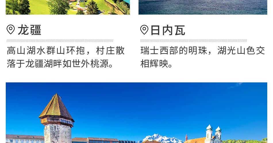 上午前往龙疆小镇,游览龙疆湖及小镇风光。之后前往卢塞恩,游览卢塞恩湖的湖光山色,听狮子纪念碑讲述瑞士人忠贞坚毅的那段历史,以及卡贝尔廊桥和八角型水塔等景点。之后前往苏黎世入住酒店。