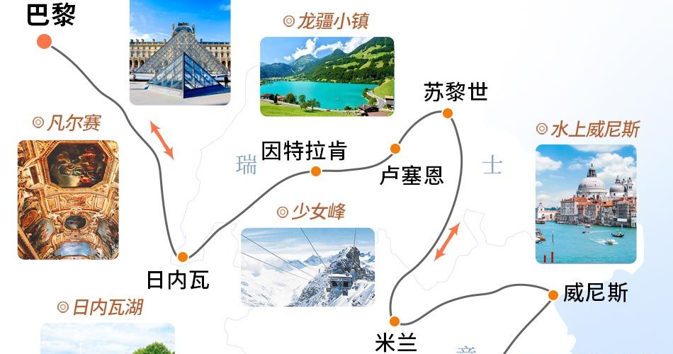 开始先后换乘3种不同的换乘体验登顶少女峰。自行依次游览格林德尔瓦尔德,艾格冰川、然后到底少女峰登顶——Top of Europe欧洲较高的火车站。前往“斯芬克斯观景台”上俯瞰白雪皑皑的少女峰登顶和阿莱奇冰川,欣赏美丽的高山风光和瀑布群乘坐齿轮火车、空天缆车、红色全景列车、垂直天梯游览水晶宫、斯芬克斯观景台、高原观景台、阿莱奇冰川冰宫等经典瑞士景点。