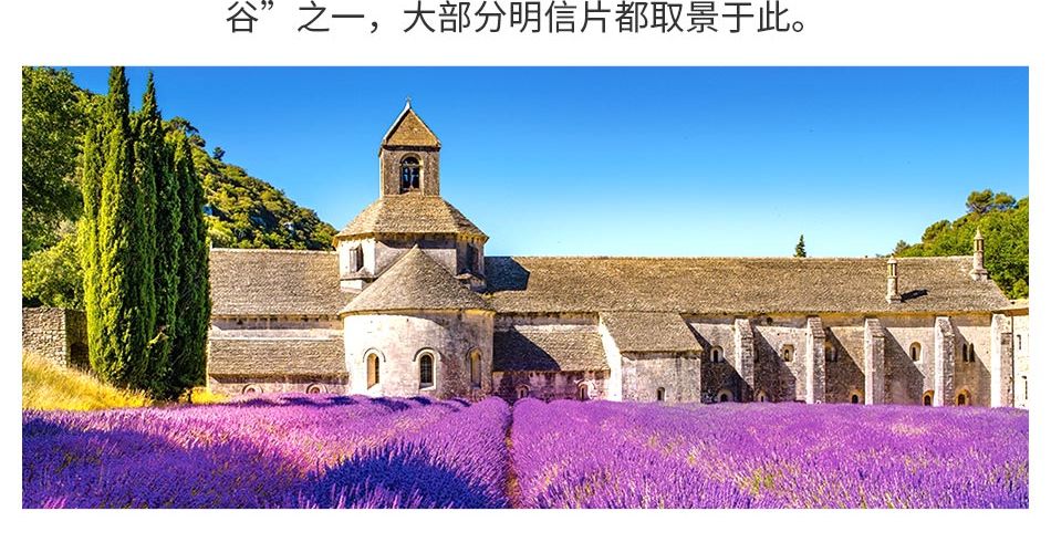 塞南克修道院位于石头城小镇北方 2 公里处, 它是由 Mazan 修道院的僧侣们修建于 1148 年,整个修道院隐藏在宁静的山谷中,也是《山居岁月》一书的故事背景。这里被称为“全法国美丽山谷”之一,大部分明信片都取景于此。尽管如此,这里的熏衣草花田规模却相对较小,有时候游客较为密集,参观的时候请尽量保持安静。