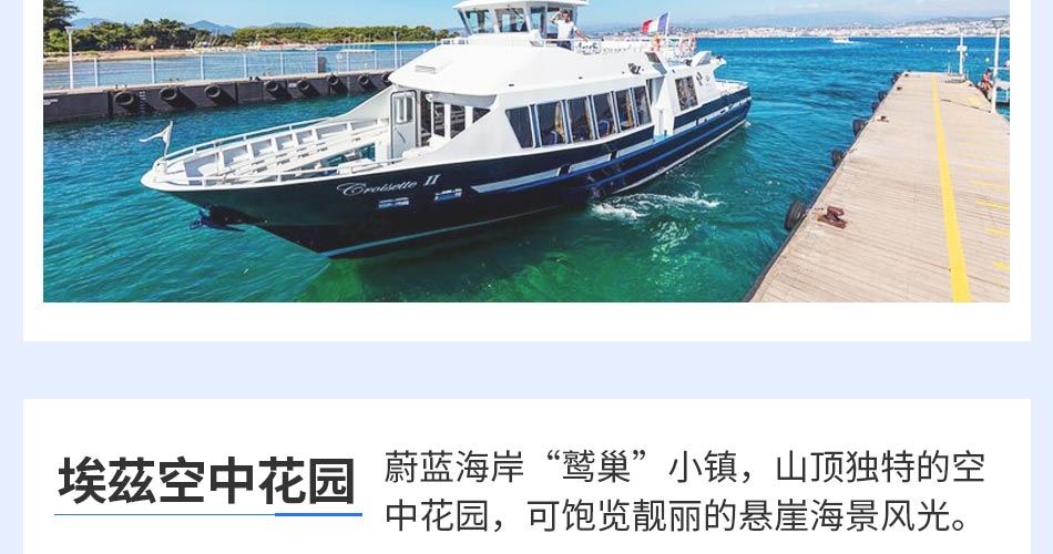 乘船横渡法国作曲家古诺创作《罗密欧与朱丽叶》的所在地圣拉斐尔与拥有法国璀璨夏天“太阳城”之称的圣特洛佩,品味蔚蓝海岸风情,拥抱地中海(游船时长约1小时)。