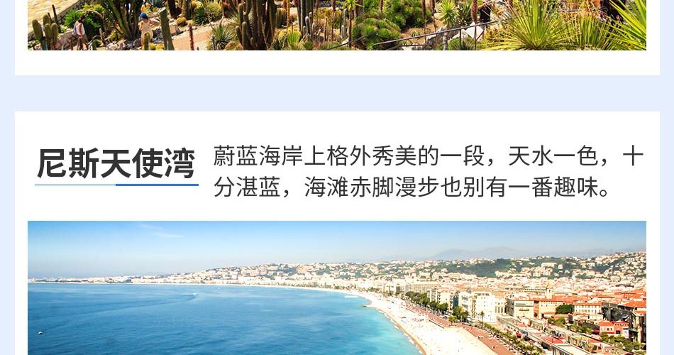 行程内两晚酒店在海滨城市,都可以下海游泳,请自备泳衣。 也可以放弃摩纳哥一日游,自由在尼斯城市海滨游览,由于尼斯入住在英格兰人散步大道上,非常方便自由活动。
