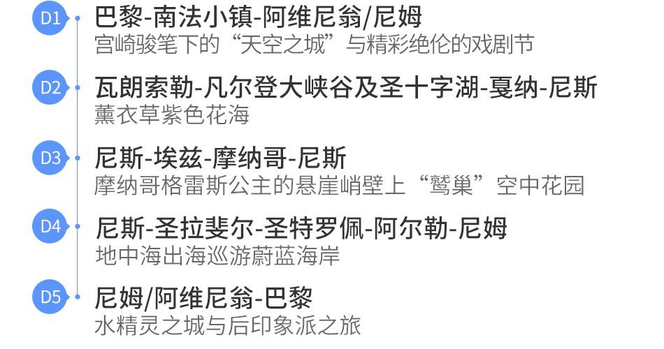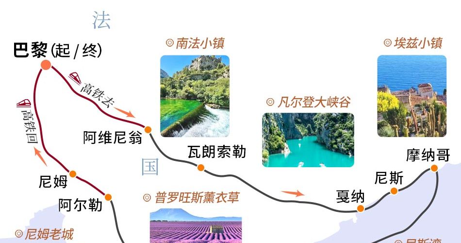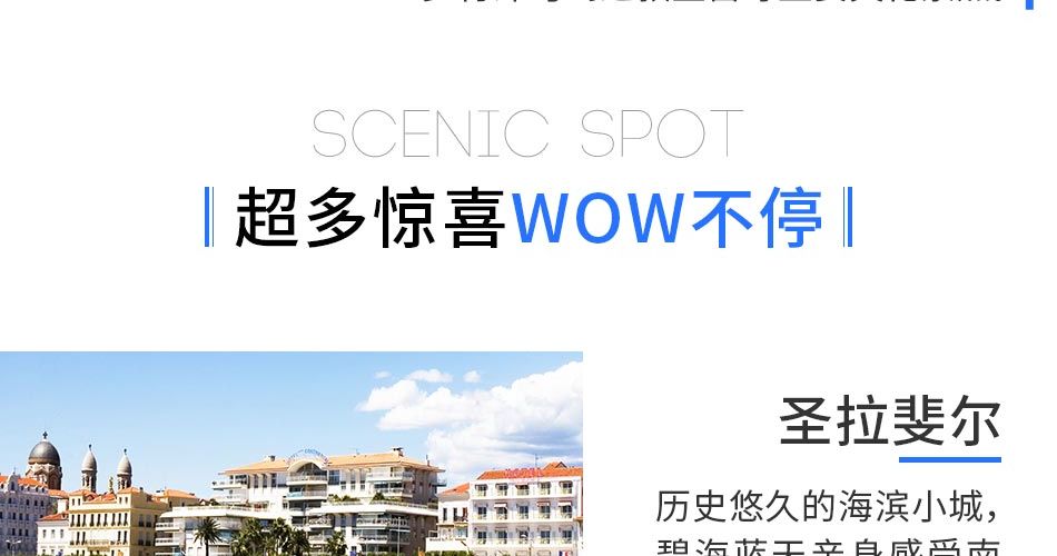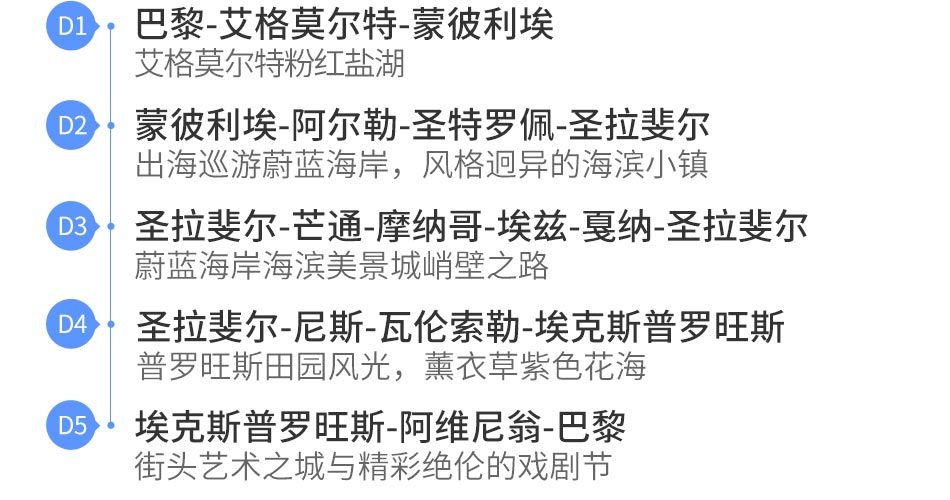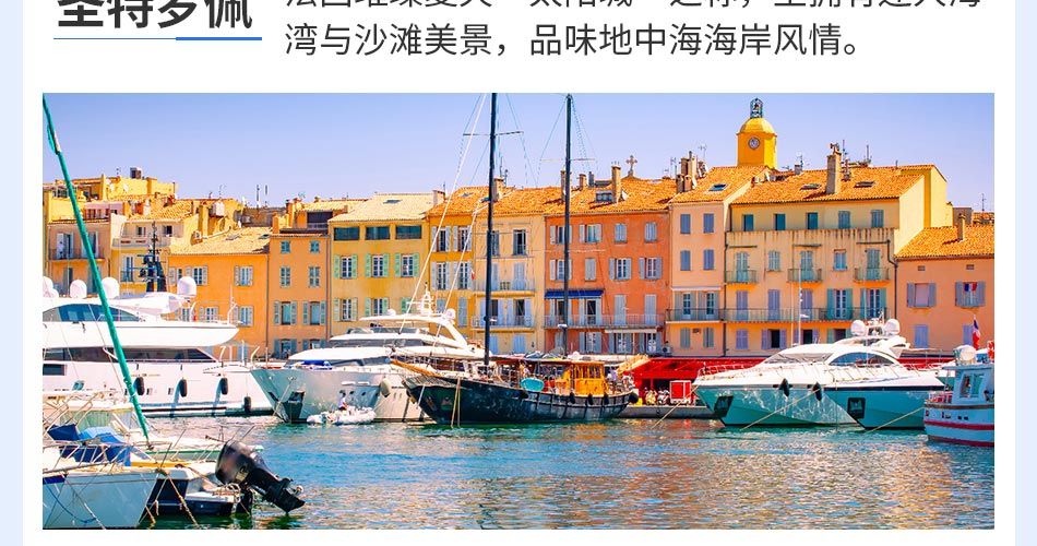 110 蔚蓝海岸5天高铁团,主要游览目的地为蔚蓝海岸和玫瑰海滨的区域,深度游览蔚蓝海岸的南法小镇,全程入住4星级海滨酒店和普罗旺斯风格酒店,包含沿途的活动项目。同时、选择火车班次也是更佳的时间段和火车站。