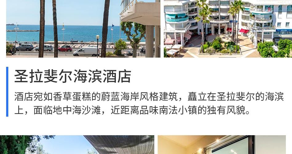 酒店宛如香草蛋糕的蔚蓝海岸风格建筑,矗立在圣拉斐尔的海滨上,酒店面临地中海沙滩,旁边各种沙滩酒吧,特色美食餐厅林林总总,晚间热闹非凡,给海滨散步提供了绝佳位置,近距离品味南法小镇的独有风貌。