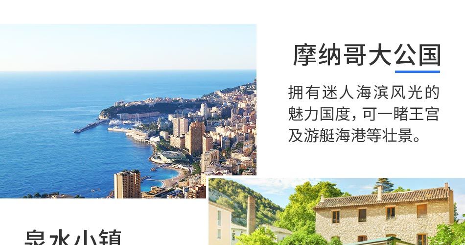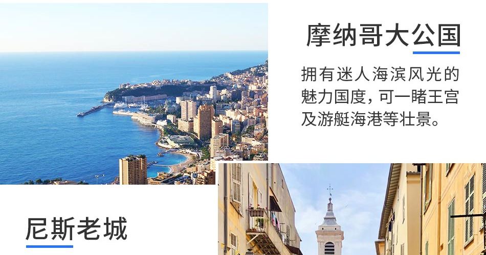 早上一路欣赏有海滨美景城之称的海滨自由城,行驶在南法的峭壁之路Moyenne Corniche; 前往悬崖小镇-埃兹,从充满地中海风情的“鹫巢”俯眺地中海。下午参观-摩纳哥及游艇码头;参观结束返回尼斯,自由参观尼斯天使湾沙滩、尼斯英格兰海滨大道等景点。