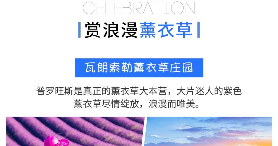备注:每年5月中下旬开始、普罗旺斯盛开大量的紫色鲁冰花(Lupinus Violet),根据不同的气温薰衣草将会在6月中下旬绽放,不同海拔高度和种植品种、一般截止到7月下旬收割。如团期内无法参观薰衣草,则更改为参观陶瓷小镇。