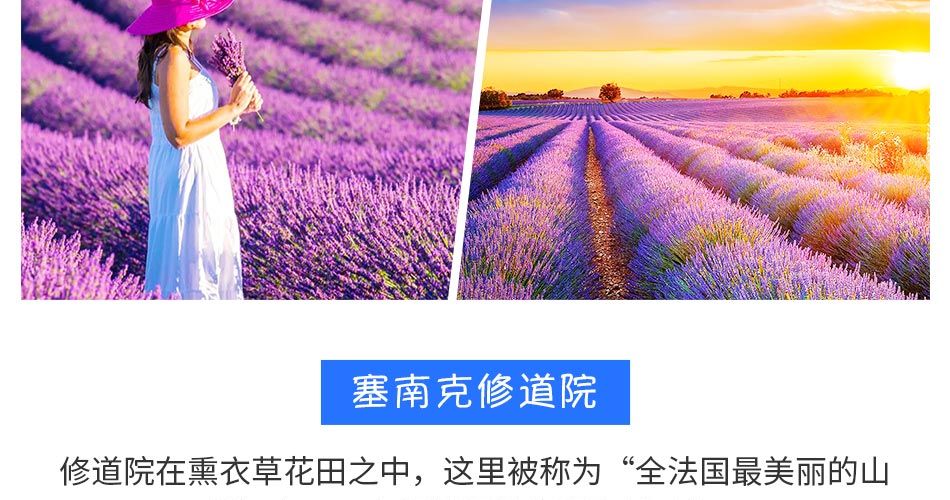 111 普罗旺斯5天高铁团,主要游览普罗旺斯的各个小镇,以观看薰衣草为主体路线,兼顾尼斯、戛纳和摩纳哥等南法大城市的游览,全程入住宜必思或2-3星级酒店。