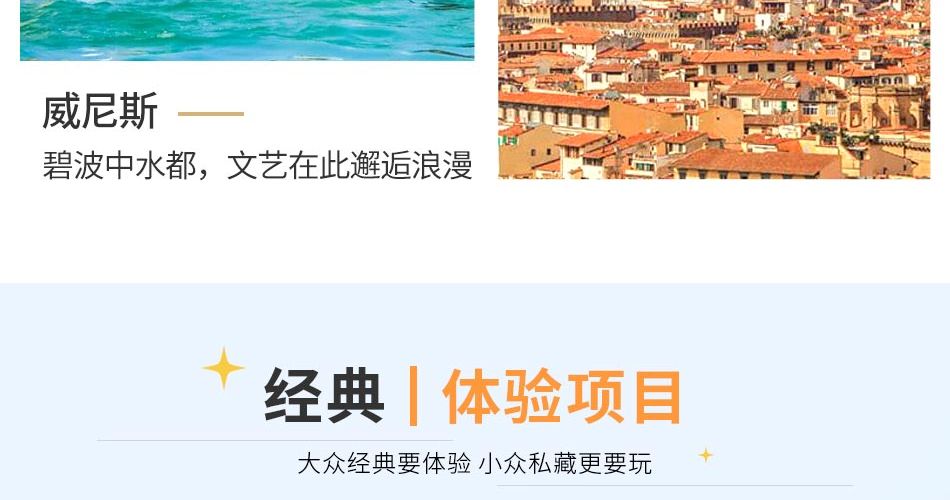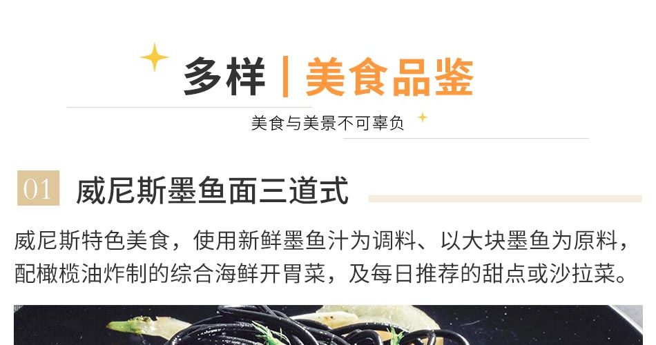 上午出发前往水城威尼斯,到达后参观圣马可大教堂(外观),圣马可广场,叹息桥(外观),华丽的总督宫(外观),这些建造在水上的美丽建筑和蜿蜒的水巷一起,让威尼斯的浪漫风情久久挥之不去。在这里您还可以品尝到威尼斯特色大餐墨鱼面三道式(自理)。