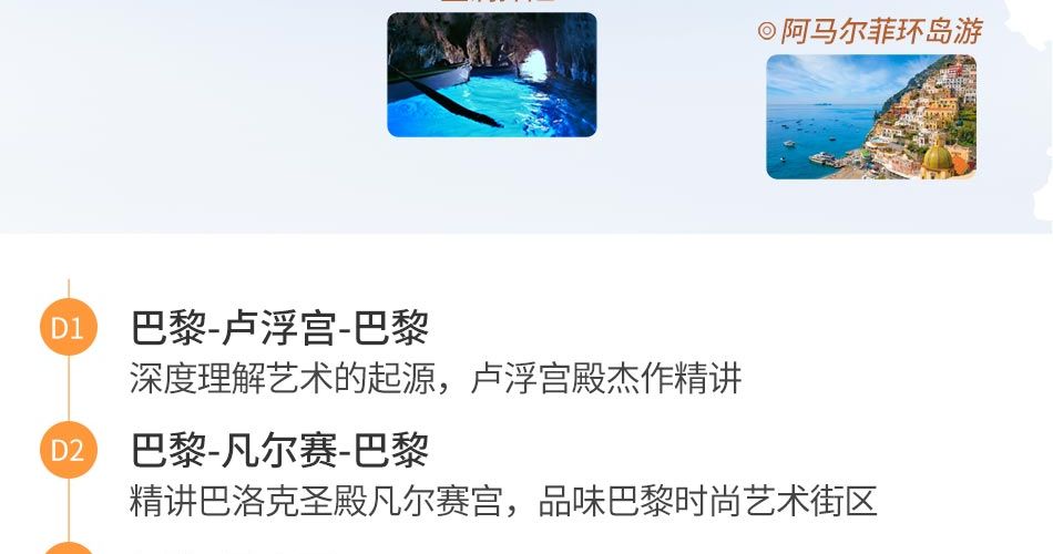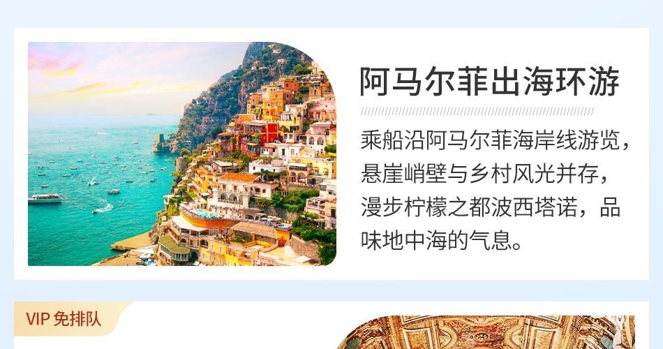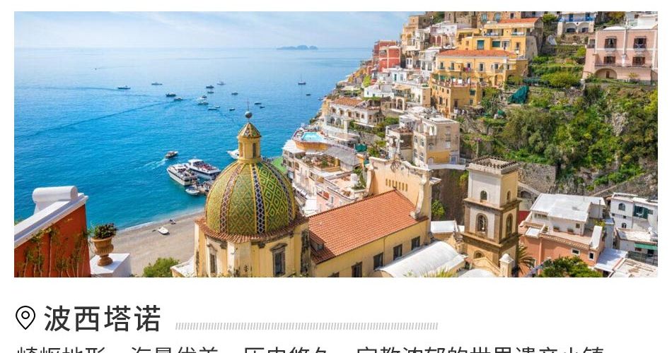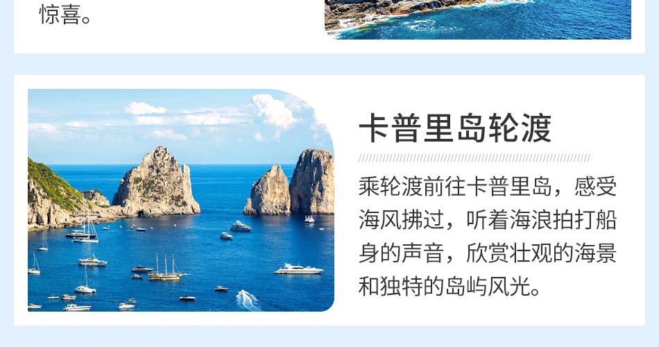 其次、跳岛游览中船为交通工具,并非游览工具,平均每段行程为40分钟到1小时,随后即可登录游览,行程中包含的许多景点,如、卡布里、波西塔诺、阿尔玛菲等都是车辆无法到达,或者不变到达的景点。