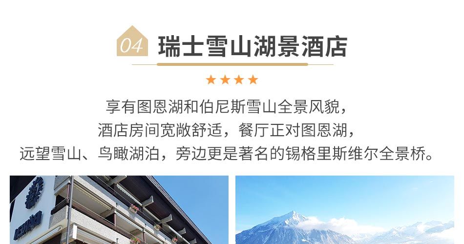 上午前往有“上帝左眼与右眼”之称的布里恩茨湖和图恩湖中央的因特拉肯,可自由游览何维克街,荷黑马特,宁静的村庄,绿树掩映,点缀在山水之间,人与自然浑然一体;或者随车前往格林德尔瓦尔德及维尔德斯维尔等少女峰山区景点,或者自费乘坐全景缆车登顶少女峰——Top of Europe欧洲较高的火车站,前往“斯芬克斯观景台”及阿莱奇冰川;或者自费前往瑞士高山探险小镇菲斯特,游览悬崖天梭巅峰栈道。