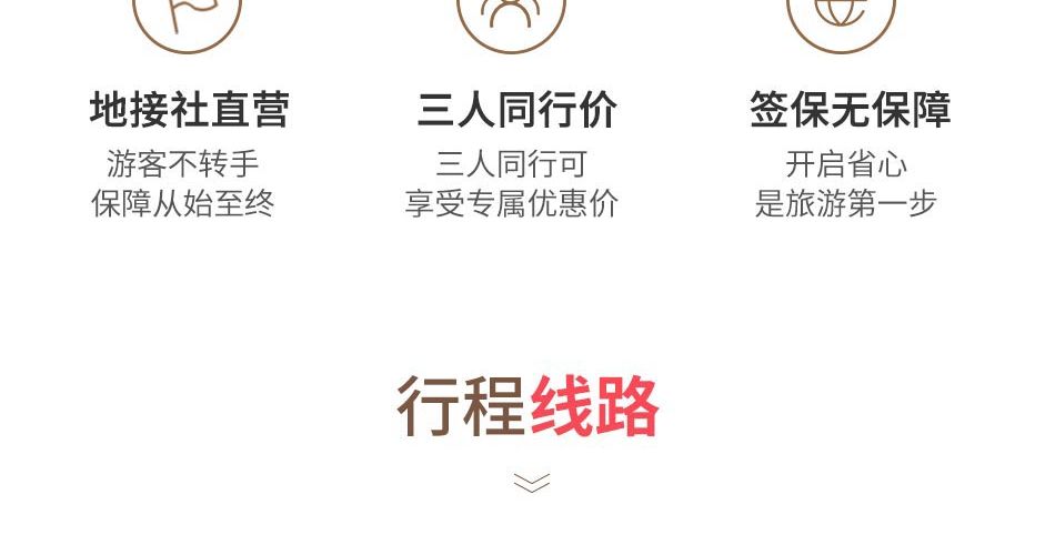 4、部分团期的行程设计游览的先后次序有所调整,但游览内容一致,不影响全程体验,视为行程与行程单一致、如行程单前后循序与出团通知书的内容有冲突、请与出团通知书为准。如出团通知书与导游现场通知的内容有冲突,请以导游现场通知为准。