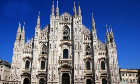 虽然它的名字Duomo是“圆顶”的意思,米兰大教堂实际上却是一座哥特式建筑。雄踞在市中心的米兰大教堂始建于1386年,历经500年才完工,被誉为意大利壮丽的哥特式建筑数以百计的尖塔耸入云霄,白色大理石外墙上雕刻着数千座雕像。内部空间宽广,阳光透过窗上美丽的彩色玻璃镶嵌画射入,光线朦胧,充满庄严的宗教气氛。教堂地下室中还保留着原址上的圣·特库拉教堂的遗迹。