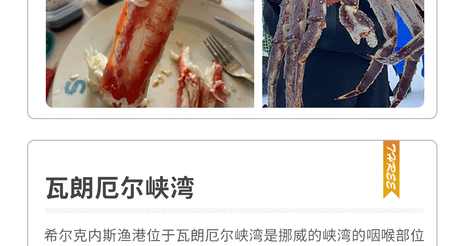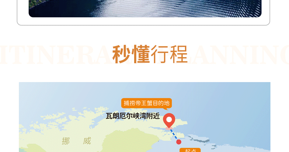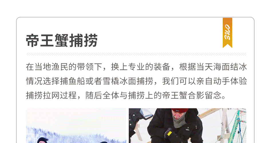 【深入峡湾】随后在帝王蟹营地换上专业的保暖服,跟随当地的探险向导,夏季搭乘渔船出海或冬季乘坐摩托雪橇前往峡湾深处的捕捞点。