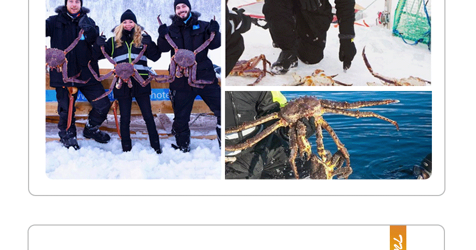 【捕捞帝王蟹】来到北冰洋的峡湾地带,到达至佳捕捞区域后观看或参与渔夫向导收网捕捞帝王蟹的过程,帝王蟹“收获”后便可与它们合影。