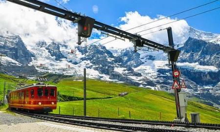少女峰齿轮火车(外观) 欧洲最高的火车站可直达少女峰的齿轮火车。少女峰登山铁路本身就是20世纪初年一大工程奇迹。修筑这条铁路用了16年时间,而为了避免滑坡和风雪,路线有相当长的部分是在艾格峰因特拉肯因特拉肯腹地内的隧道中盘旋而上的。爬山铁路有不同的路线,游客上下山在沿途可从不同角度瞻仰并肩耸立的奇峰峭岭。站在一个名叫艾格格莱奇(“格莱奇”意为“冰川”)的山间小站上,游客面前就是著名的冰川。火车再从这里开出,要钻一个长7公里的隧道,山间景色随着季节变化而变化。
