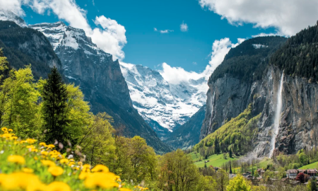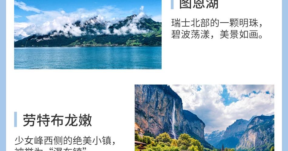 素有瀑布天堂的瑞士山涧小镇劳特不拉嫩展示传统、祥和的阿尔卑斯风格,这里原生的瑞士景色,白色的阿尔卑斯山脉、流淌着冰川雪融水、翠绿的山坡牧满着奶牛、红色的齿轮火车悠悠扬扬的逆行而上,山涧的雾气要绕宛如仙境一般
