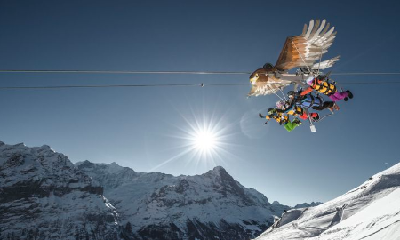 著名的菲斯特空天探险索道——悬崖天梭巅峰栈道,在少女峰雪山背景中乘坐空中贡多拉飞跃菲斯特,游览悬崖天梭巅峰栈道,格林瓦尔德少女峰地区惊险刺激的冒险天堂。