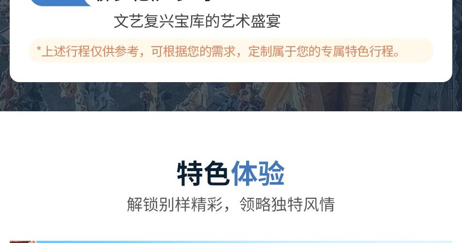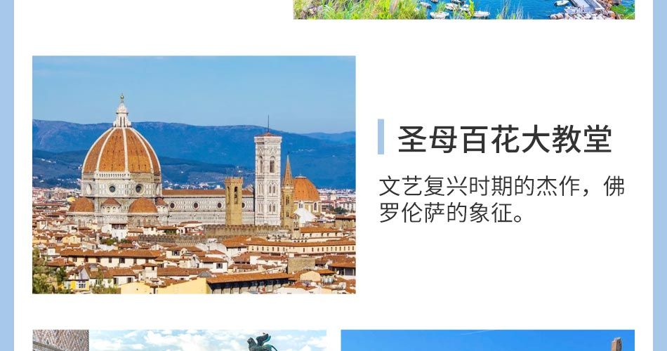 在世界艺术之都、文艺复兴的发源地佛罗伦萨,享受一场震撼的视觉盛宴!在蓝天白云,彩色鲜艳的墙壁,深绿色的百叶窗,深红色的屋顶之间寻找文艺复兴的灵魂,在大街小巷、广场教堂,博物馆、美术馆之中感受文艺复兴不老。正如作家陈运和所说“阿利盖利.但丁的诗魂、达.芬奇的画魂,仍在佛罗伦萨上空飘荡,仍继续追寻欧洲文艺复兴时期那些人与事.....''