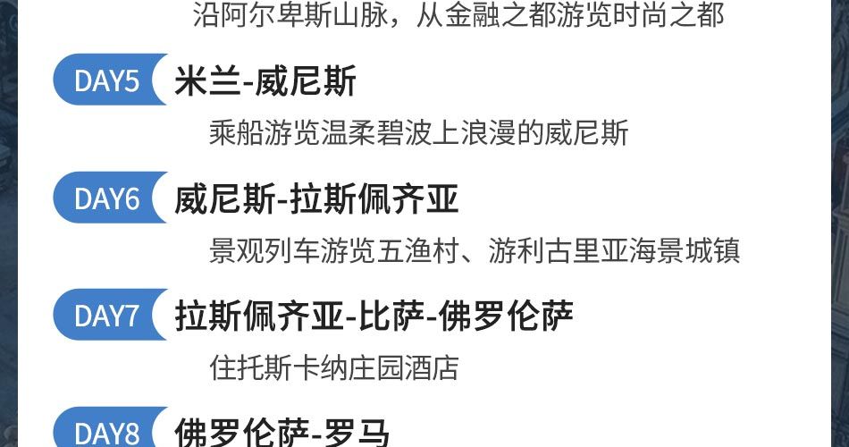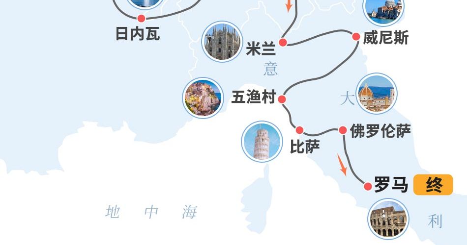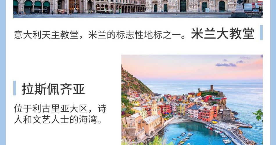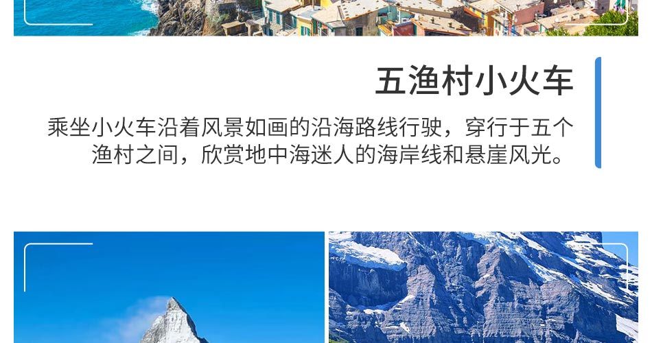 【如遇恶劣天气或者铁路公司罢工等因素导致无法游览五渔村、行程将自动更改为乘坐大巴车或其它形式游览海岸线城市】