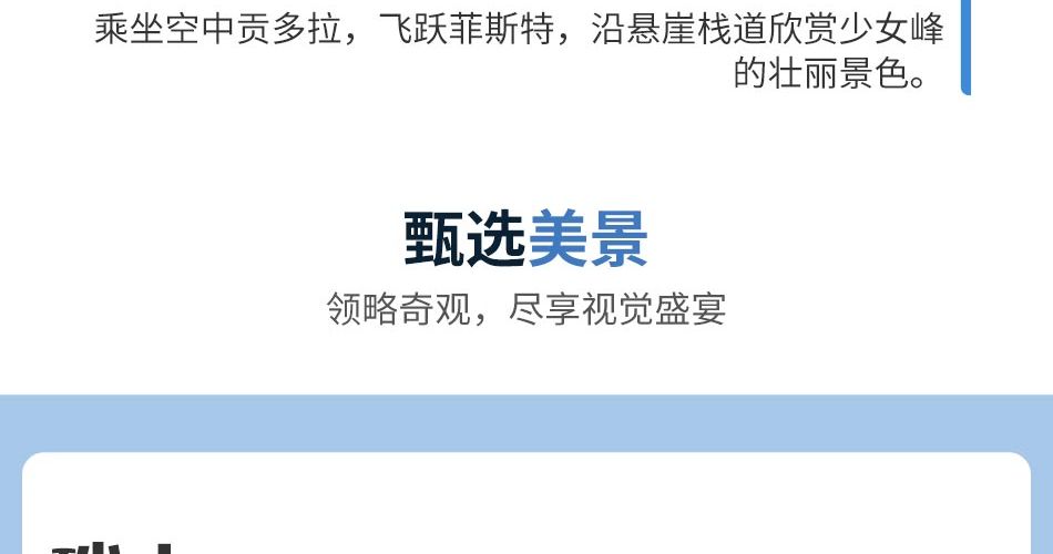 作为瑞士著名的代表性旅游胜地,少女峰不是座雪山,而是围绕着少女峰、因特拉肯的一系列不同的瑞士风景组合,包含多种不同的雪山体验,成就了精彩而丰富的瑞士少女峰 、菲斯特,格兰维尔德,劳特不拉嫩等景点旅游景区。 少女峰登顶景观缆车,可以感受7程不同的体验。菲斯特空天冒险乐园,作为空天探险类旅游项目的始祖,而高空滑翔伞不仅仅装饰了雪山,还给年前群体带来了许多的刺激活动。