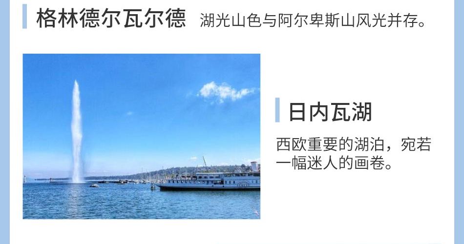 上午前往有上帝左眼与右眼之称的布里恩茨湖和图恩湖中央的因特拉肯,可自由游览何维克街,荷黑马特,宁静的村庄,绿树掩映,点缀在山水之间,人与自然浑然一体;或者随车前往格林德尔瓦尔德、劳特布伦嫩及维尔德斯维尔等少女峰山区景点,或者乘坐齿轮火车登顶少女峰——Top of Europe欧洲最高的火车站,前往“斯芬克斯观景台”及阿莱奇冰川;或者前往瑞士高山探险小镇菲斯特,游览悬崖天梭巅峰栈道。