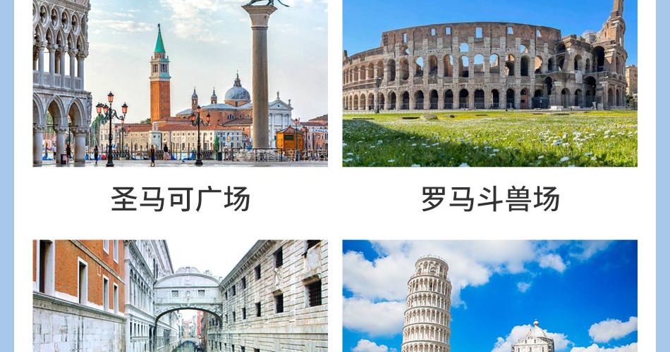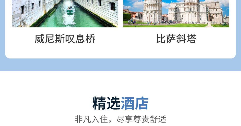 上午出发前往水城威尼斯,到达后参观圣马可大教堂,圣马可广场,叹息桥(外观),华丽的总督宫(外观),这些建造在水上的美丽建筑和蜿蜒的水巷一起,让威尼斯的浪漫风情久久挥之不去。在这里您还可以品尝到威尼斯特色大餐墨鱼面三道式。
