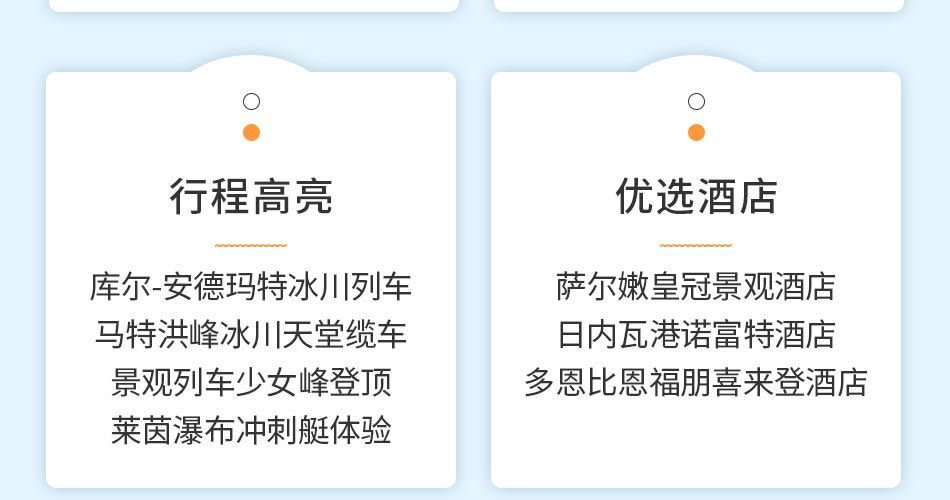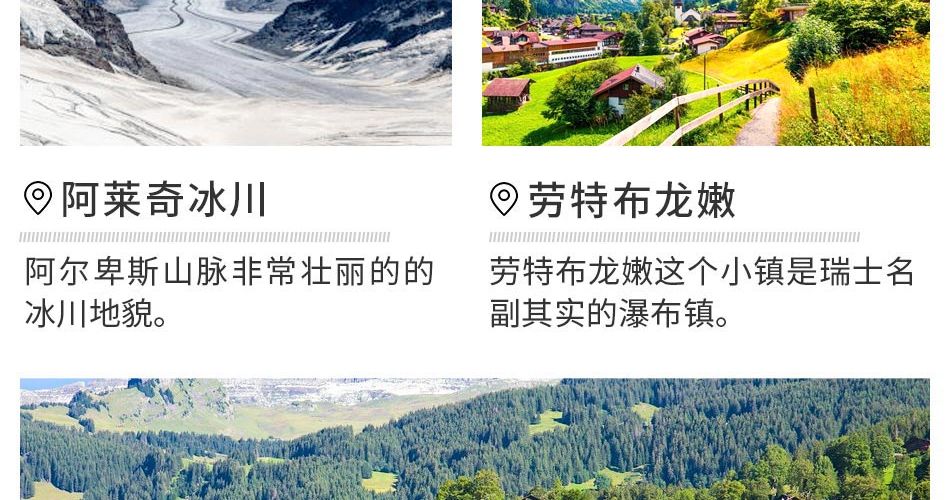 选择少女峰,则默认不去菲斯特;选择菲斯特,则默认不上少女峰。如都不选择,则默认跟车游览维尔德斯维尔、格里德尔瓦尔德及劳特布伦嫩。