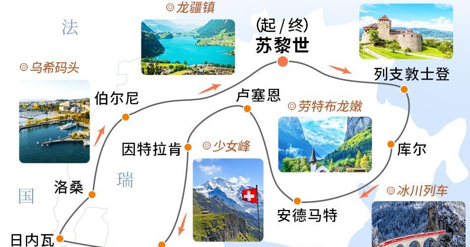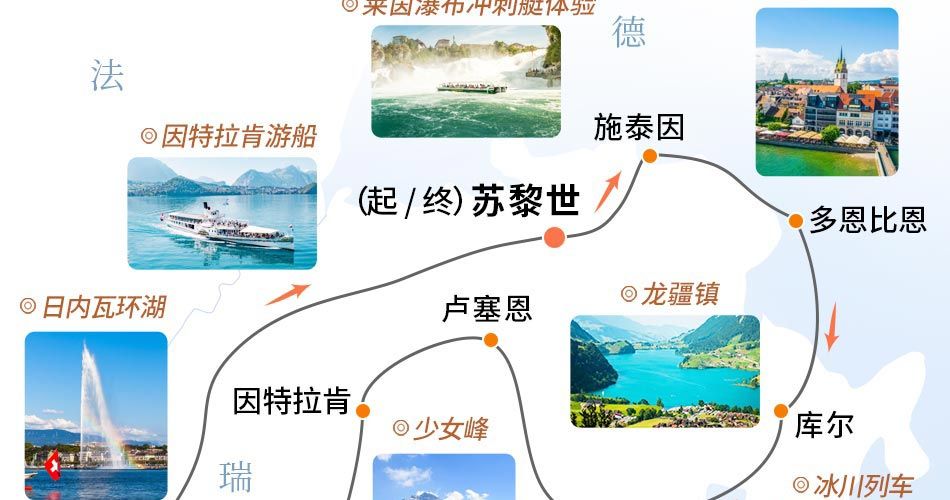 开始先后换乘7种不同的交通体验登顶少女峰。自行依次游览格林德尔瓦尔德,艾格冰川、最后到底少女峰登顶——Top of Europe欧洲第一高的火车站。前往“斯芬克斯观景台”上俯瞰白雪皑皑的少女峰登顶和阿莱奇冰川之后途经劳特布龙嫩,欣赏美丽的高山风光和瀑布群乘坐齿轮火车、空天缆车、红色全景列车、垂直天梯游览水晶宫、斯芬克斯观景台、高原观景台、阿莱奇冰川冰宫等6个经典瑞士景点。