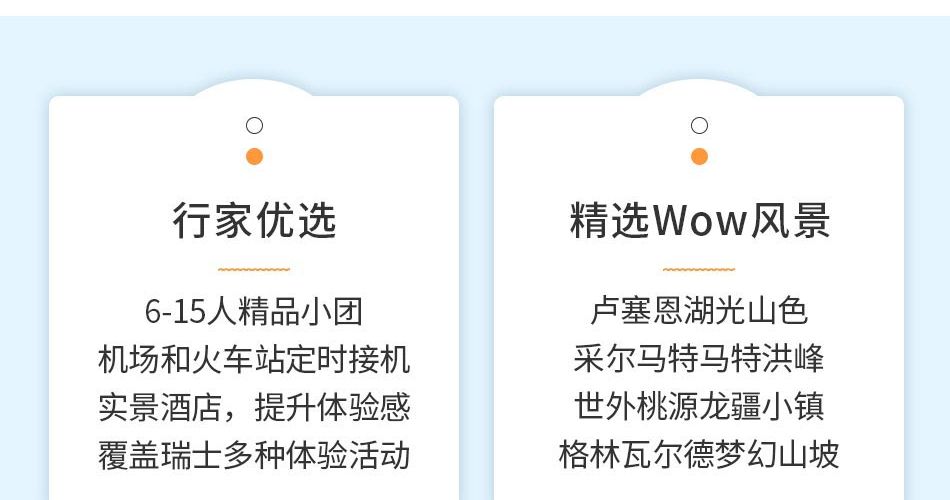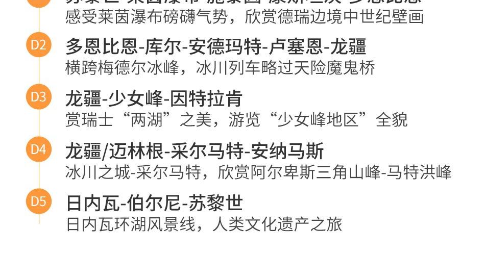 本产品不推荐结束当天离开苏黎世的航班!参团当天最晚12:00前可在苏黎世上团,但苏黎世市区景点会无法游览,并无费用可退!