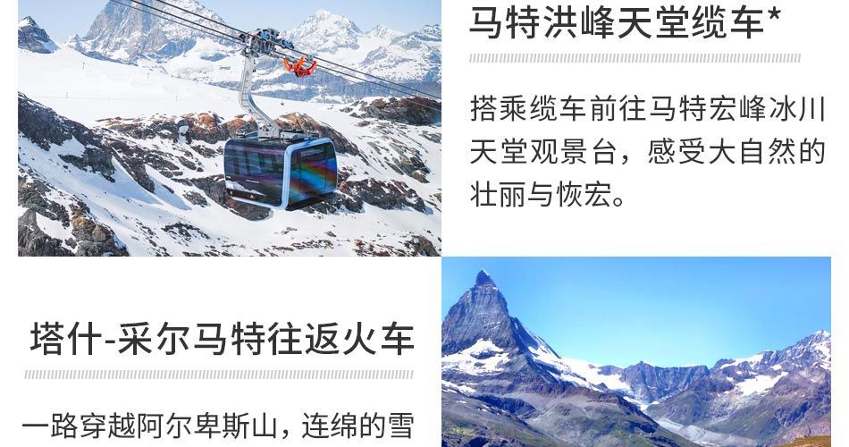 注意事项:采尔马特及马特洪峰冰川天堂缆车上无导游陪同,行程内包含塔什-采尔马特观光列车,导游无法陪同前往,如购买玛特洪峰冰川天堂缆车,需要自行换乘并自备简餐。