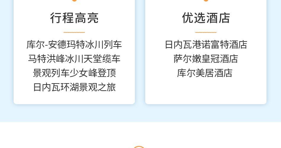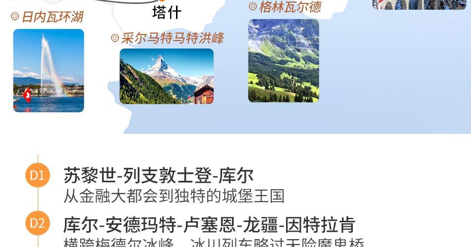本行程内含超过1000米海拔的常规景点:“采尔马特-1640米”、“格林瓦尔德-1034米”、“安德玛特-1470米”,”如有基础疾病,请报名前与医生确认是否能前往高海拔地区。