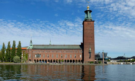 斯德哥尔摩市政厅位于瑞典首都市中心的梅拉伦湖畔,是斯德哥尔摩的形象和代表,也是该市市政委员会的办公场所。建于1911年,历时12年才完成,是瑞典建筑中重要的作品。建筑两边临水,一座巍然矗立着的塔楼,与沿水面展开的裙房形成强烈的对比,加之装饰性很强的纵向长条窗,整个建筑犹如一艘航行中的大船,宏伟壮丽。