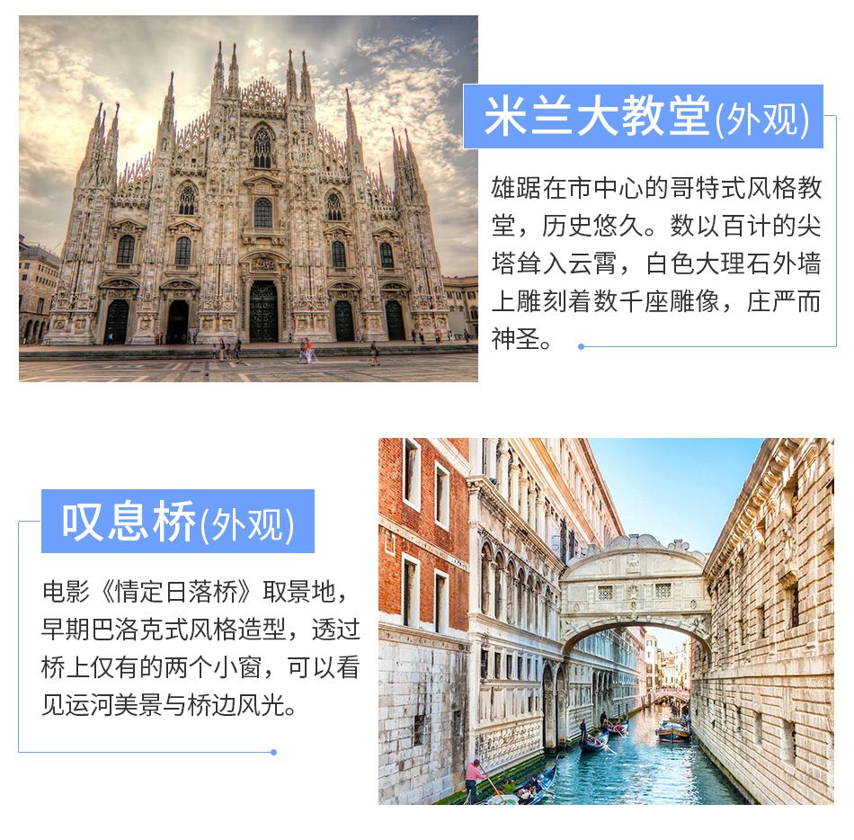 上午游览时尚之都-米兰,到达后自由参观米兰的标志性建筑米兰主教堂(外观),欧洲漂亮的商业拱廊之一埃马努埃莱二世长廊。 下午出发前往莎士比亚名著的原型城市——维罗纳,漫步于罗密欧古城。“维罗纳”源于拉丁语,意为"极高雅的城市", 其历史可追逐到史前时期,是意大利最古老,最秀丽,最典雅,也最具特色的城市之一。 夜宿威尼斯岛外梅斯特拉古纳宫酒店或同等级4星级酒店