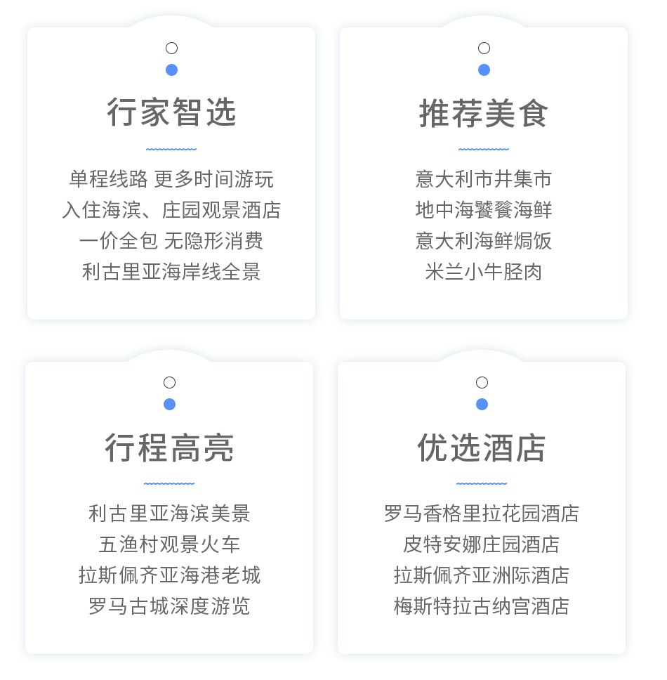 6.【门票】: 五渔村小火车,威尼斯运河游船等体验项目费用,斗兽场首道门票及行程内所包含的景点景区首道门票(标注“外观”的景点费用不包含,敬请自理)。