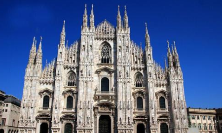 虽然它的名字Duomo是“圆顶”的意思,米兰大教堂实际上却是一座哥特式建筑。雄踞在市中心的米兰大教堂始建于1386年,历经500年才完工,被誉为意大利壮丽的哥特式建筑数以百计的尖塔耸入云霄,白色大理石外墙上雕刻着数千座雕像。内部空间宽广,阳光透过窗上美丽的彩色玻璃镶嵌画射入,光线朦胧,充满庄严的宗教气氛。教堂地下室中还保留着原址上的圣·特库拉教堂的遗迹。