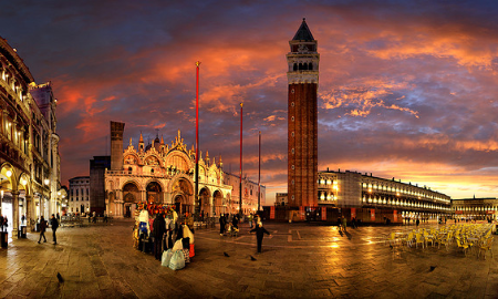 是威尼斯的中心广场,曾被拿破仑称作“欧洲美丽的客厅”。广场三面被宏伟壮丽的宫殿围绕,东面耸立着高大的钟楼和圣马可教堂。自古以来,就是威尼斯政治、宗教及传统节日的公共活动中心。