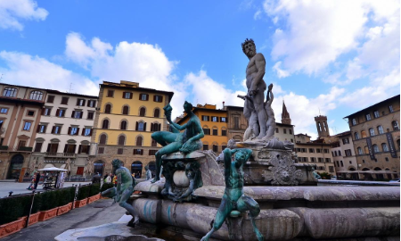 市政广场有露天雕塑博物馆的美誉,也是该城数个世纪以来政治生活中心,广场上坐落着维琪奥宫(旧宫)、米开朗基罗雕塑作品《大卫》的复制品以及海神喷泉。开放式的市政广场,周围环绕着乌菲兹美术馆、佣兵凉亭和众多的咖啡厅、酒吧。著名的圣母百花大教堂就位于它的正北方。