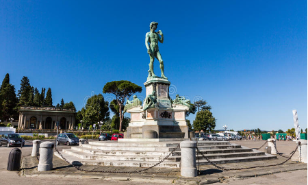 位于佛罗伦萨东南的米开朗基罗广场是著名的俯瞰城市美丽全景的地点,广场中央安放着米开朗基罗的不朽之作——《大卫》的复制品,广场上可以看到全城的风貌:圣母百花大教堂、乔托钟楼、巴杰罗美术馆、老桥等尽收眼底。这里也是观赏日出和日落的好位置,随着光线的变幻,看佛罗伦萨焕发出不同的光彩。