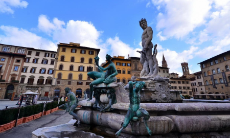市政广场有露天雕塑博物馆的美誉,也是该城数个世纪以来政治生活中心,广场上坐落着维琪奥宫(旧宫)、米开朗基罗雕塑作品《大卫》的复制品以及海神喷泉。开放式的市政广场,周围环绕着乌菲兹美术馆、佣兵凉亭和众多的咖啡厅、酒吧。著名的圣母百花大教堂就位于它的正北方。
