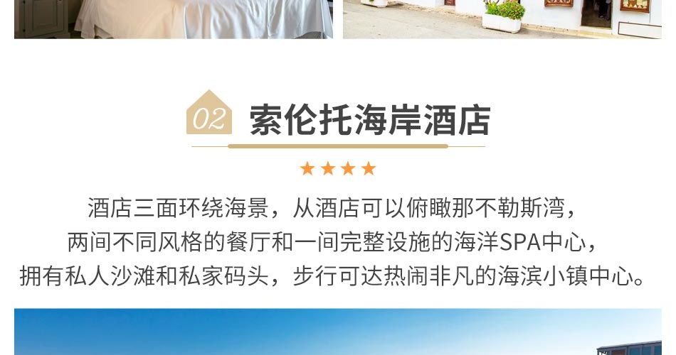 酒店位于欣赏索伦托海景的优质选择,拥有壮丽的索伦托那不勒斯海湾的景观,酒店三面环绕海景,拥有私人沙滩和私家码头,两间不同风格的餐厅和一间完整设施的海洋SPA中心,步行可达热闹非凡的海滨小镇中心,酒店码头就是出海游艇的停泊点。