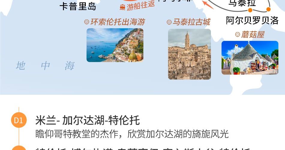 备注:如遇海上极端天气情况,出于游客安全考虑,游船公司取消出海游览波西塔诺活动,我社将安排当天乘坐车参观萨勒诺,无法参观波西塔诺,出海游船费用将退还给游客。