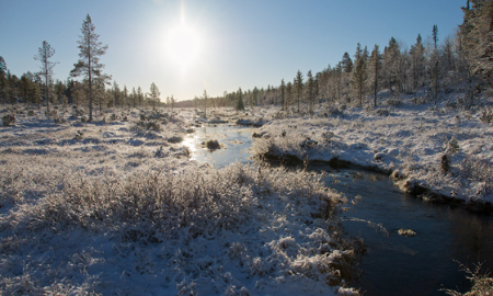 上团后前往瑞典和芬兰的交接之湖,晚上进行雪鞋徒步,夜宿Torne河畔极光营地。