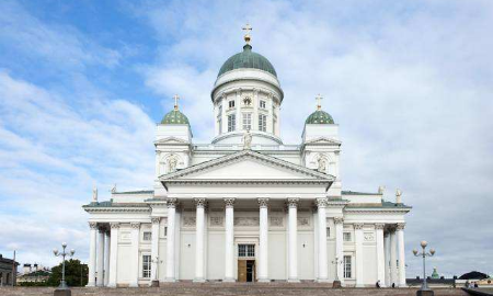 坐落于议会广场前的赫尔辛基大教堂是赫尔辛基出名的建筑,绿色的拱顶十分醒目,无论在市区的哪个角落都能看到这座气宇非凡的乳白色绿顶建筑,因此也被称为“白教堂”。