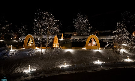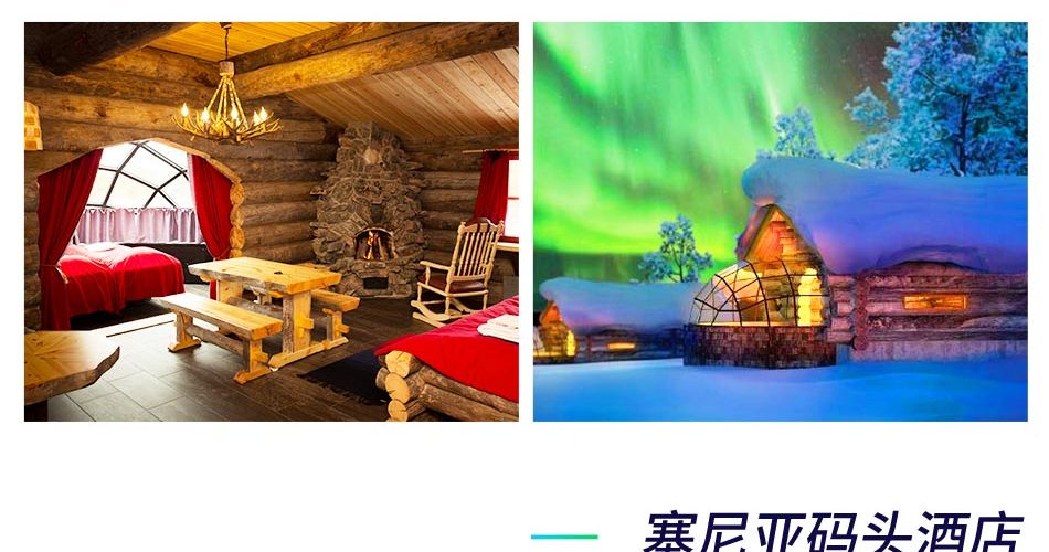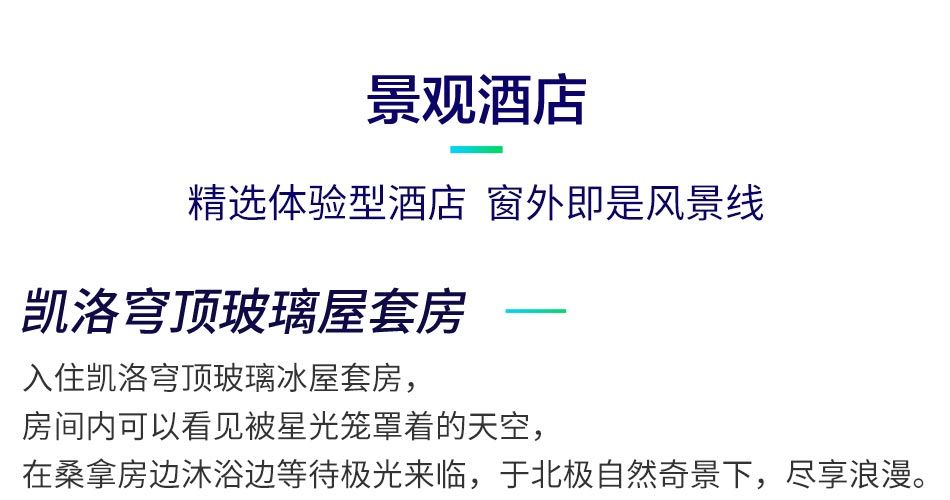 穹顶玻璃屋度假村玻璃冰屋西村(west village)的凯洛穹顶玻璃冰屋套房被授予人文景观度假村及美国国家地理杂志评选自然人文景观区,入住卡克斯劳塔纳穹顶酒店的凯洛玻璃冰屋套房,在星光下的极光漫步,于北极自然奇景下赞叹野旷天低雪树与极光的相映成辉。 凯洛穹顶玻璃冰屋套房,独立的玻璃屋及独立内部走廊通向原生态的豪华木屋,面积约90平米,房间内可以点篝火,分为浪漫穹顶玻璃冰屋,儿童住宿区,豪华大床,独立桑拿区,从纯木头装修,质感和舒适度非常高。