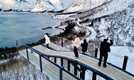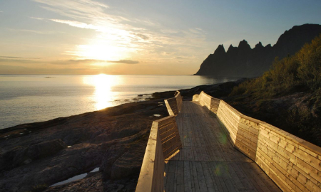 早餐后,乘车前往塞尼亚岛,沿途游览挪威国家公园旅游路线塞尼雅环半岛之旅,第一站抵达贝格斯景观台(Bergsbotn)观景台,站在上面可以俯瞰到壮美的贝格斯峡湾(Bergsfjord),这里的风景迷人,接着来到欣赏恶魔之齿(Devil's Jaw)的地点奇迹山峦瞭望台(Tungeneset),远眺塞尼亚岛最著名的奥克斯曼群锋山(Okshornan),这个独特的岩石形成酷似一排巨大的牙齿,是徒步和摄影的绝佳之地。最后来到精灵峡湾海滩(Ersfjord),美丽的沙滩上因有一座享有“黄金厕所”(Golden toilet ersfjord)之称的独特的设计和绝佳的景观视角而闻名。在这里,我们可以短暂休息,享受海滩的宁静与美丽。夜宿塞尼亚码头酒店或同等四星级其他酒店。