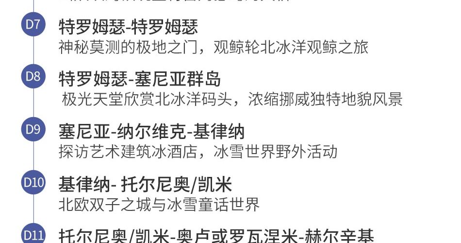 由于鲸鱼在每年冬季洄游到温暖的特罗姆瑟交配和生育属于自然现象,根据当地渔民的经验及渔汛的发布,预计每年1月下旬之后可能受到动物迁徙影响,无法看到鲸鱼,届时我社将更改路线,改为峡湾游览(不再另行通知,该线路的调整不视为线路更改),由于挪威当地燃油船向电力船的过度时期,不同的船只有不同的安全性能要求,如遇飓风、海面管制、暴雪等不可力抗事件,不同船只的安全要求有不同规范标准,我社将根据当地海事部门的规则执行当天行程。