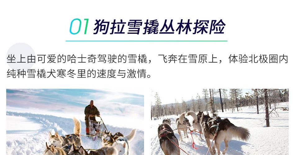 参观雪橇犬营地(kennel)先与雪橇犬建立互相信任的感情,在当地爱斯基摩人的帮助下,自行捆绑缰绳组建狗拉雪橇狗队(一般为6-8条雪橇犬为一组团队),2-4人为一组,雪橇犬在原生态的冰冻丛林里和结冰的湖面上尽情的飞驰。活动时间约为2小时左右。具体路线取决于当天天气情况,具体分组由当地向导决定。(4岁以下无法参加狗拉雪撬活动项目,全程需家长陪同;4-11岁儿童需父母在同一雪橇上陪同,不可以单独乘坐。)安全提示:【所有的雪地项目具有一定的危险性,并且普通旅游保险并不包含雪地活动及滑雪项目,请查阅保单】